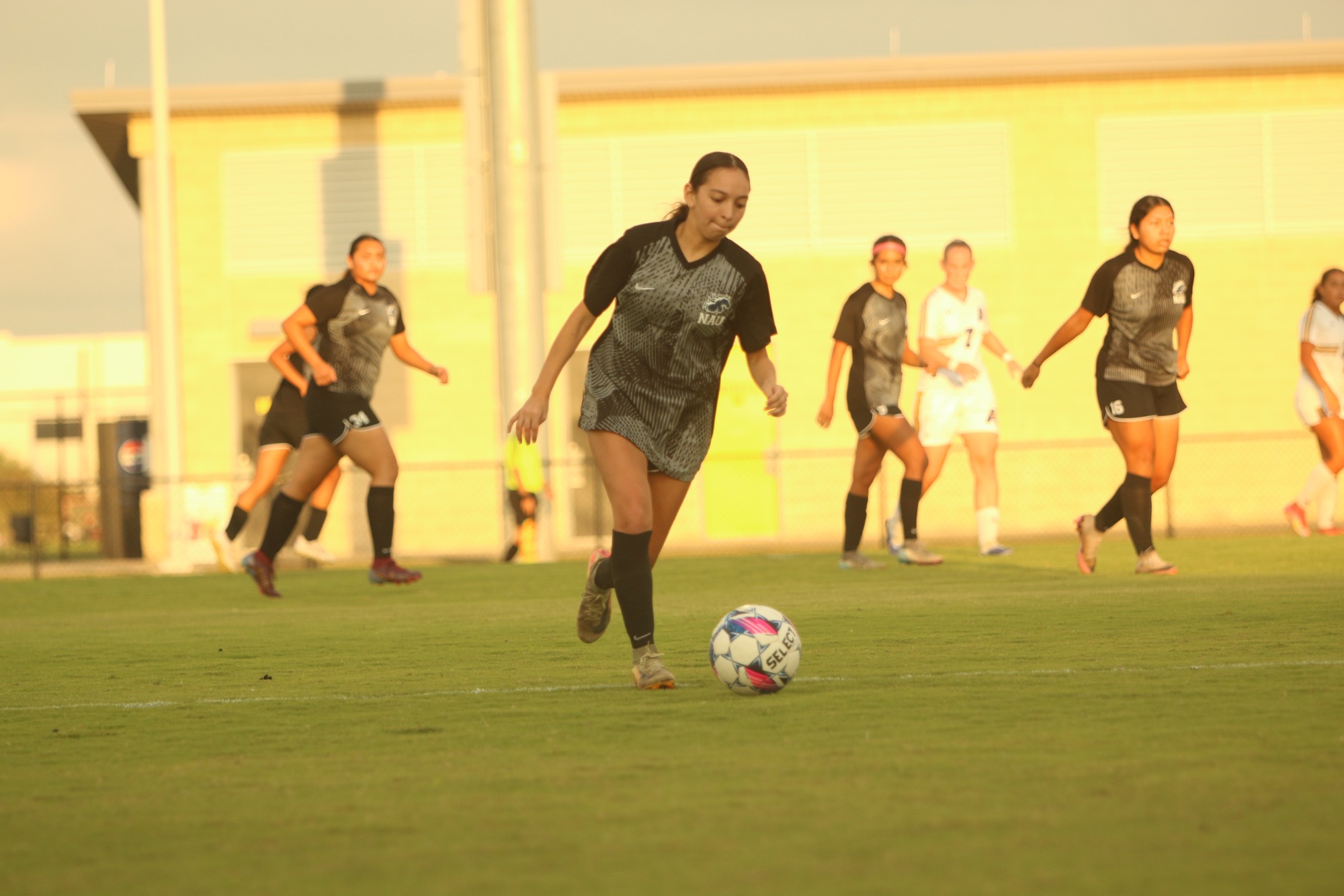 TSU's midfield pressed high and hard, living in the Lady Stallions' faces with relentless pressure. And it paid off. In the 22nd minute, McKayla Flores delivered a dangerous service from the right touchline. Savannah Muldrew rose to the moment, timing her left-foot strike perfectly for a rainbow shot that kissed just under the crossbar and just over the outstretched fingers of NAU keeper Arely Sarabia. TSU took the 1-0 lead.
